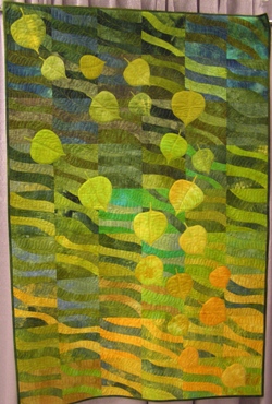 What is the colour associated with loss? I think of basswood leaves in autumn. They seem to grow more luminous as they change from green to gold. In the last few years, I have come to feel that aging is characterized by a series of losses (parents, friends, jobs, health, etc.). The downward flow of leaves on this quilt represents the losses experienced over a lifetime. The golden hue near the bottom represents the hope and joy that can still be experienced even in the midst of loss.