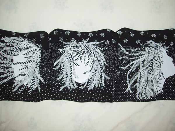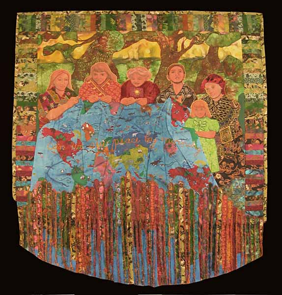“Can We Sew Peace by Morning” came to me after thinking about the war in Iraq and the many wars that have plagued humankind. Quilters are a very compassionate people, often devoting hours of work into a quilt to be given to someone in need. This quilt depicts five women and a child, each expressing a slightly different emotion which they have embroidered into the quilt of the world as the sun begins to rise in the background. The fringe depicts that which is yet unfinished, threads of love not yet woven into the fabric of the world.
