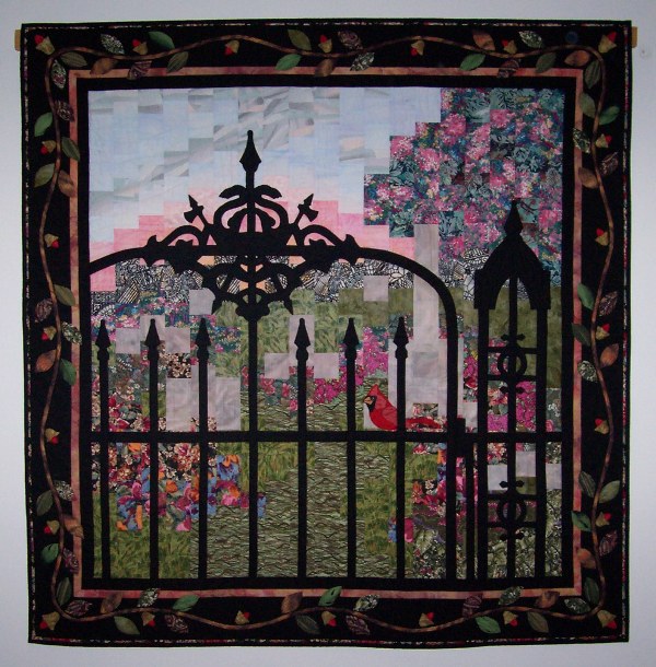 Several years ago, after visiting the cemetery in eastern North Carolina where four generations of my grandparents rest, I knew I must make a quilt. The gate, in particular, was ever in my mind. Its motifs were haunting, as if expressing the grief felt by the loss of each generation. The counterpoint is that which lives – the flowers, the cardinal; and most importantly, their souls. On the back there is a shadowed square representing the life of each one resting there. These are sacred threads binding me to those who have gone before.