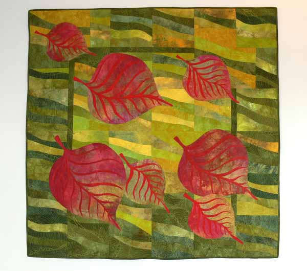 Hand dyed cotton fabrics by the artist. Textile paints, variegated cotton threads, metallic threads and rayon threads. Fused appliqué. Free motion/machine quilted.
